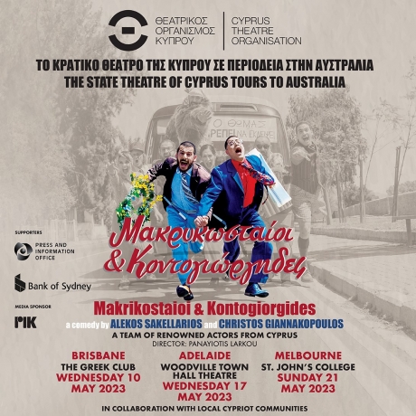Συγκεκριμένα, θα ταξιδέψει στο Μπρισμπέιν, την Αδελαΐδα και την Μελβούρνη, με την παραγωγή της σκηνής Εκτός Έδρας «Μακρυκωσταίοι και Κοντογιώργηδες» των Αλέκου Σακελλάριου και Χρήστου Γιαννακόπουλου, σε σκηνοθεσία Παναγιώτη Λάρκου, που πέρυσι γνώρισε μεγάλη επιτυχία στην Κύπρο.