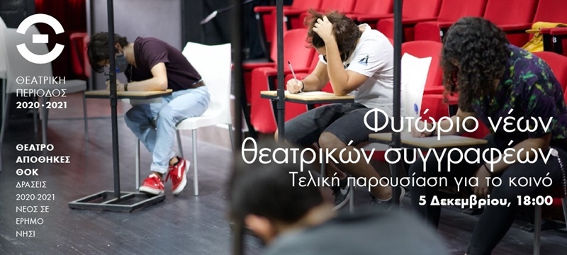 Ύστερα από πέντε εντατικά σαββατοκύριακα, πολλές άδειες σελίδες, πολλές σκισμένες σελίδες, πολλές μουτζουρωμένες σελίδες, οι νεαροί συγγραφείς έγραψαν τις δικές τους σύντομες σκηνές. Τα έργα τους θα παρουσιαστούν με τη μορφή σκηνοθετημένου αναλογίου από την ομάδα των ηθοποιών των Δράσεων 2020-2021: «Νέος σε έρημο νησί» το Σάββατο στις 5 Δεκεμβρίου και ώρα 18:00 στο Θέατρο Αποθήκες ΘΟΚ.