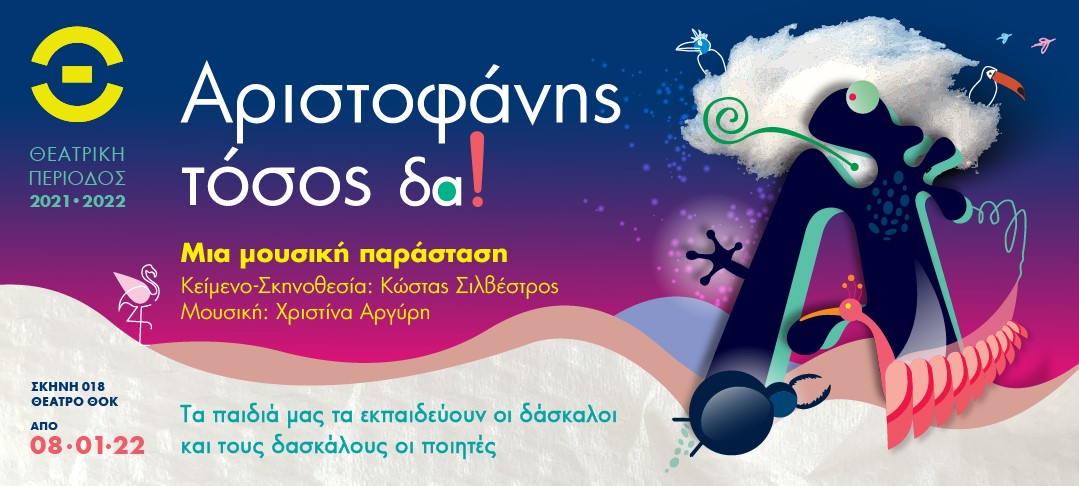 Η παραγωγή της Σκηνής 018 Αριστοφάνης τόσος δα! των Κώστα Σιλβέστρου και Χριστίνας Αργύρη, συνεχίζει τις παραστάσεις της στην Κεντρική Σκηνή – Αίθουσα Εύης Γαβριηλίδης με ανανεωμένη διάθεση, για να γεμίσει τα Σαββατοκύριακά μας μουσική, χρώματα και δράση, μέσα από ένα πρωτότυπο κείμενο του Κώστα Σιλβέστρου, βασισμένο σε έργα του Αριστοφάνη (Ειρήνη, Βάτραχοι, Όρνιθες). Ραντεβού λοιπόν στο Θέατρο ΘΟΚ αυτό το Σάββατο 15 και την Κυριακή 16 Ιανουαρίου 2022.