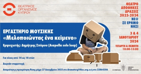 Οι Δράσεις «Νέ@ σε έρημο νησί» του ΘΟΚ διοργανώνουν διήμερο εργαστήριο μουσικής με τον μουσικό Δημήτρη Σπύρου (Acapella solo loop) που απευθύνεται σε νέους από 14 έως 18 ετών, με τίτλο «Μελοποιώντας ένα κείμενο».