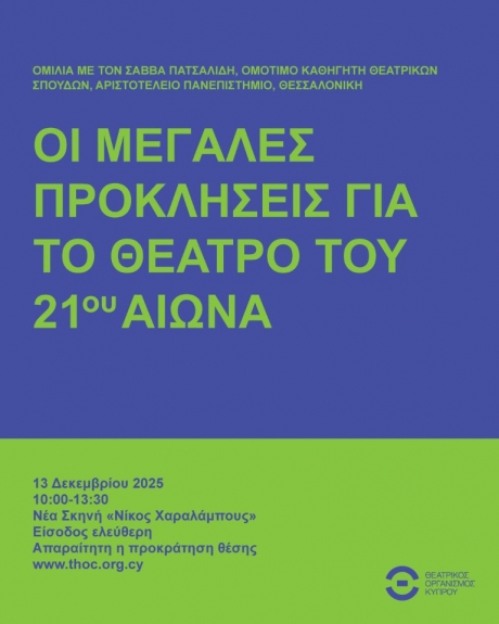 Η τοποθέτηση του Σάββα Πατσαλίδη στοχεύει να ανοίξει έναν ουσιαστικό διάλογο για το τι είδους θέατρο, ηγεσία και κοινότητα χρειαζόμαστε, ιδίως σε μικρές πολιτισμικές γεωγραφίες, όπως η Κύπρος, ώστε το θέατρο να παραμείνει ζωντανό εργαστήριο ενσυναίσθησης, αλήθειας, παρέμβασης και συλλογικότητας μέσα σε έναν κόσμο διογκούμενης αλγοριθμικής ομοιομορφίας.